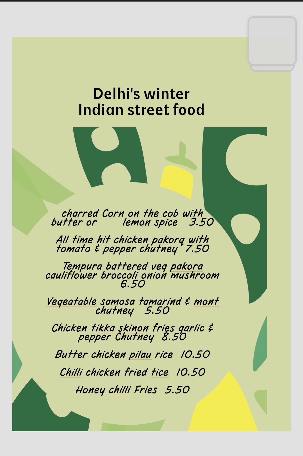 Indian street food Chicken pakora with skin on fries , tomato & mango chutney GF 8.50 Assorted tempura batter , broccoli, cauliflower, onion, spinach , potato GF 7.50 Butter chicken pilau rice , mild creamy curry GF,N, D 10.50 chili & lime salmon , skin on fries , sweet chili , mint chutney GF,D 10.50 chicken tikka , skin on fries , garlic mayo , chili & mango chutney GF,D 8.50 mushroom curry bake D 6.50 Corn on cob , lime & spice or butter GF, 3.50 chicken nuggets & chips 7.50